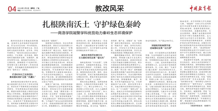 12月8日,《中國教育報》第四版“教改風采”欄目刊發了校長權雅寧教授的署名文章,以《扎根陜南沃土 守護綠色秦嶺——商洛學院凝聚學科優勢助力秦嶺生態環境保護》為題,對我校積極主動投身秦嶺生態環境保護的特色創新舉措及成果作了專題報道。文章指出,商洛學院以“綠水青山就是金山銀山”理念為指引,主動承擔守護秦嶺生態、傳承秦嶺文化的歷史使命。學校聚焦秦嶺區域的尾礦治理、水源保護、循環發展等方面問題,凝練提升材...
