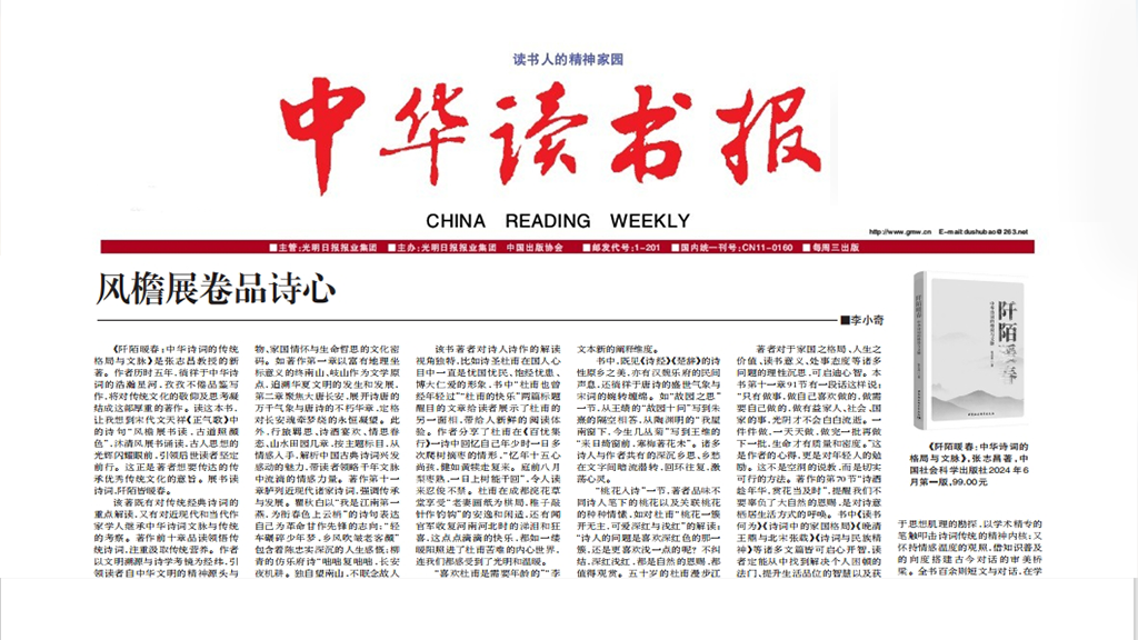 5月14日,《中華讀書報》刊發我校人文學院教授李小奇書評文章《風檐展卷品詩心》。文章系統解讀了《阡陌暖春:中華詩詞的格局與文脈》一書的邏輯脈絡,分享了閱讀本書的心得體悟,深入闡釋了書中蘊含的家國格局和生命哲思。《阡陌暖春:中華詩詞的格局與文脈》一書,是我校張志昌教授近期出版的新書。全書共分十一個章節,從多元角度對浩如煙海的中華詩詞進行了精彩闡釋,于娓娓道來中帶領讀者徜徉詩歌長河,在清風明月間一同體悟...