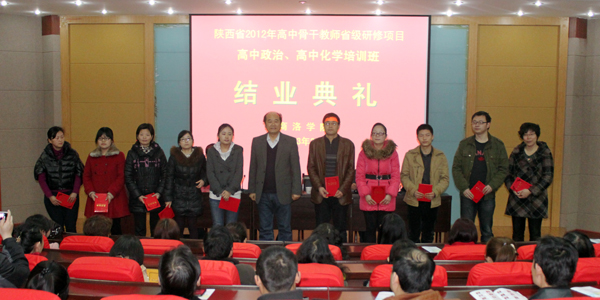 3月12日上午,我院承辦的陜西省2012年高中骨干教師省級研修項(xiàng)目高中政治、高中化學(xué)培訓(xùn)班舉辦了結(jié)業(yè)典禮。院長、學(xué)院“國培計(jì)劃”和省級培訓(xùn)項(xiàng)目領(lǐng)導(dǎo)小組組長張景書,副院長、學(xué)院“國培計(jì)劃”和省級培訓(xùn)項(xiàng)目領(lǐng)導(dǎo)小組副組長劉建林親臨結(jié)業(yè)典禮現(xiàn)場,與學(xué)員們合影留念,并為學(xué)員們頒發(fā)證書。