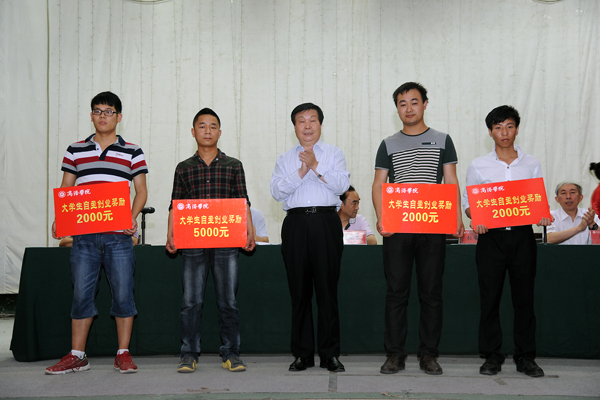 張景書在講話中向受表彰、受資助學生,并通過他們向全體在校學生提出了四點希望:一是希望同學們立志高遠,樹立堅定理想信念,及早確立努力學習、不斷超越自我的奮斗目標,早日實現美好的理想;二是希望同學們抓住大學幾年的機會,在校刻苦學習,練就服務祖國、報效祖國的本領,把自己塑造成為國家建設需要的應用型人才,為實現中國夢貢獻自己的力量;三是希望同學們增強創業意識、創業精神,把自己塑造成為具有創新思維和創業能力的高素質創新型人才,通過創新創業服務創新型國家建設,實現自身價值;四是希望同學們以身邊的優秀學生為榜樣,學習先進,錘煉高尚品格,積極倡導社會文明新風,積極參加志愿服務,主動承擔社會責任,為學校發展和社會進步再立新功。