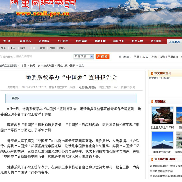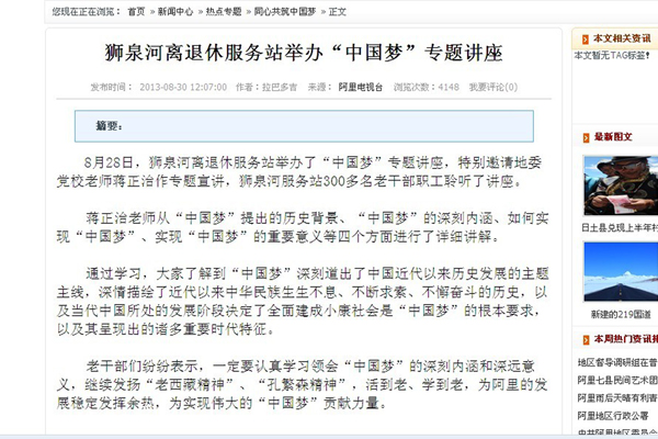 根據(jù)安排,蔣正治還將在阿里地區(qū)老干局、阿里地區(qū)公安處、阿里軍分區(qū)等單位宣講“中國(guó)夢(mèng)”。