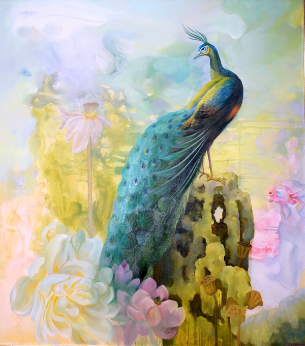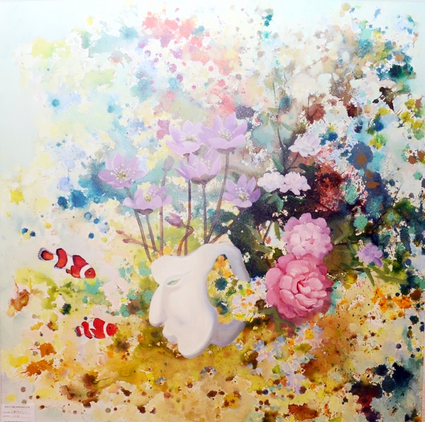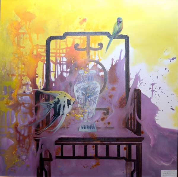 楊靜的作品多以意象風景為主,魚、飛鳥、椅子、面具、鮮花常常成為畫面中的主要視覺符號,意象化的表述方式是其繪畫語言特點,獨具視覺張力的畫面背后蘊藏著或浪漫或神秘或抒情的藝術獨白。她的作品,一切似乎都是從畫布的縫隙間不經(jīng)意地流淌、蔓延而出,生發(fā)、幻化出諸多“意外之境”,堅實的文化底蘊與繪畫技能,獨到的藝術眼界和隨機靈動的“深思妙悟”,賦予畫面中各種意象生命,讓畫內(nèi)的意象引領聯(lián)想畫外意象,達成“象外之象,景外之景”的效果,結合自己的生命體驗詮釋對當代人及其生存環(huán)境的思索與追問,在虛實相生之間營造一個全新的美好境界。本次畫展共展出作品50多件,且全部被3家藝術投資機構收藏。