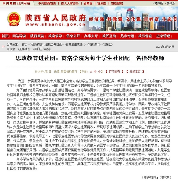 4月3日,陜西省人民政府網站《思政教育進社團:商洛學院為每個學生社團配一名指導教師》一文,對我校通過聘任形式,為每一個學生社團配備一名思政指導教師,進一步貫徹落實黨的十八屆三中全會對高校學生工作提出的新任務、新要求,用社會主義核心價值體系引導學生社團發展、青年學生成長進行了報道。(http://www.shaanxi.gov.cn/0/xxgk/1/2/4/22/35/39/124/37505.htm)