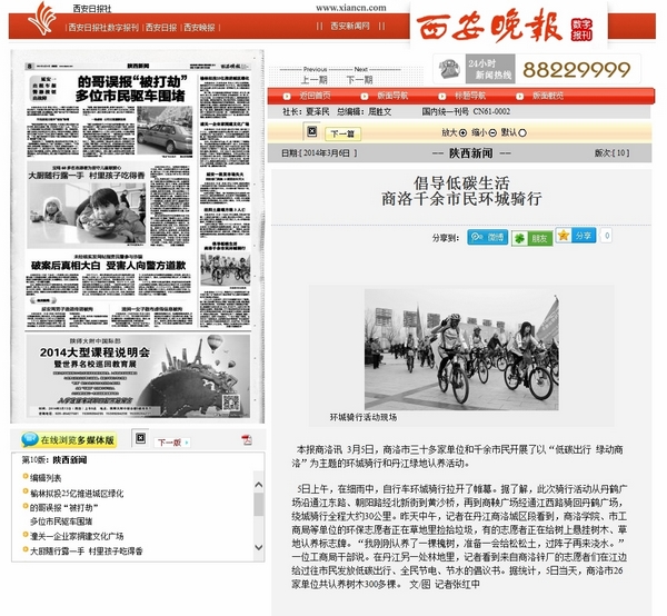 《西安晚報》3月6日報道了我校學子服務地方經濟社會發展,積極參與商洛市“低碳出行 綠動商洛”為主題的環城騎行和丹江綠地認養活動。(http://epaper.xiancn.com/xawb/html/2014-03/06/content_280850.htm)