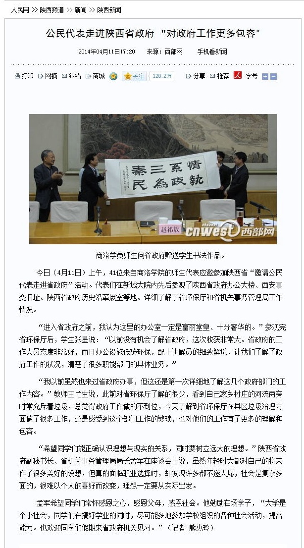 人民網、西部網等4月11日以《公民代表走進陜西省政府 “對政府工作更多包容”》為題,對我校師生走進陜西省政府參觀學習進行了報道。(http://sn.people.com.cn/n/2014/0411/c190208-20979066.html)