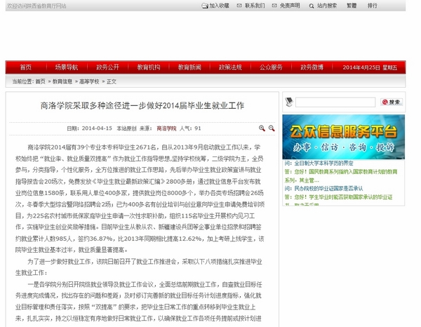 截至4月25日,自2014年以來,陜西省教育廳網站共報道我校新聞共15條,平均每周都有1條新聞在省教育廳網站發布。其中,4月份共有6條報道我校,平均每4天就有1條。4月15日,省教育廳《商洛學院采取多種途徑進一步做好2014屆畢業生就業工作》一文對我校就業工作進行報道。(http://www.snedu.gov.cn/jynews/gdxx/201404/15/40791.html)