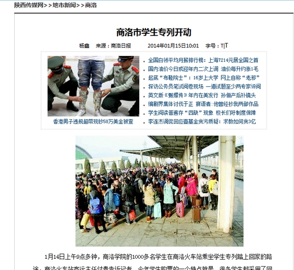 陜西傳媒網《商洛市學生專列開動》一文,報道了寒假前期我校積極聯系商洛火車站調配車輛,開通學生專列,方便學生乘車回家。(http://www.sxdaily.com.cn/n/2014/0115/c55-5332744.html)