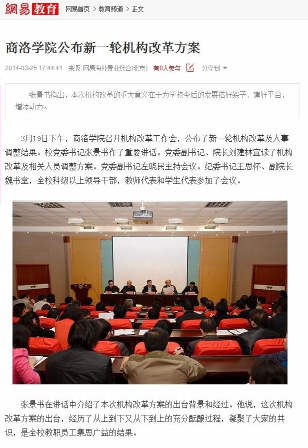 網易教育頻道以《商洛學院公布新一輪機構改革方案》為題,對我校機構改革進行了報道。(http://edu.163.com/14/0325/17/9O6UDM9V00294IJT.html)