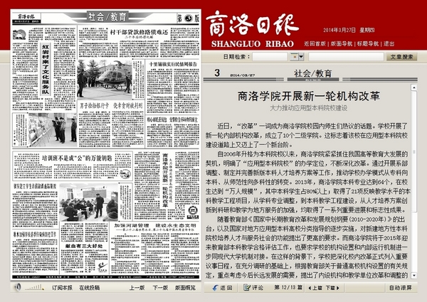 《商洛日報》3月27日以《商洛學院開展新一輪機構改革》為題,對我校機構改革進行了報道,并對我校10個二級教學單位進行連續報道介紹。(http://eslrb.slrbs.com/slrb/20140327/)