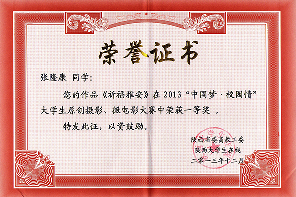 2013“中國夢?校園情”大學生原創攝影、微電影大賽由陜西省委高教工委和陜西大學生在線主辦,西北政法大學承辦,西安交通大學、西北農林科技大學、西北工業大學、長安大學、西北大學、西安工程大學、西安文理學院、西安體育學院、西安翻譯學院協辦。大賽旨在深入貫徹落實十八大精神,推動校園網絡文化建設,提升陜西大學生的文化品位,豐富大學生的校園生活,宣傳和展示高校人文文化氛圍。大賽累計收到全省27所高校師生網上投稿作品3252幅,最終評選出攝影作品一等獎5名,二等獎10名,三等獎13名,優秀獎14名;微電影作品一等獎1名,二等獎2名,三等獎3名,優秀獎15名。