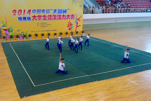 5月27日至6月1日,由陜西省教育廳主辦,陜西省學生體育協會、西安郵電大學承辦的2014年陜西省大學生健康活力大賽于在西安郵電大學(長安校區)體育館舉行。來自全省49所高校的1299名運動員參加本次比賽。我校健美操隊參加了普通高校組3個項目的比賽。經過緊張激烈的角逐,我校代表隊獲得中國風健身舞(草原雄鷹)第二名,健身排舞第二名,街舞推廣套路JAZZ規定套路第五名,總團體第十名,并獲得“體育道德風尚獎”。王晨晨同學獲得 “優秀運動員”稱號,教練張玉蘭應邀擔任本次比賽的裁判工作并獲得“優秀裁判員”稱號。