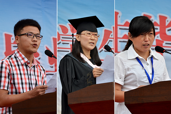 畢業生代表、經濟與管理學院會計學專業2010級李真回憶了在校的四年光陰,對學校給自己帶來的種種收獲與感動表示真誠的感謝。生物醫藥與食品工程學院2011級學生劉淵代表在校生對畢業生送上了美好的祝愿,并代表全體在校生表達了勤勉學習的決心。