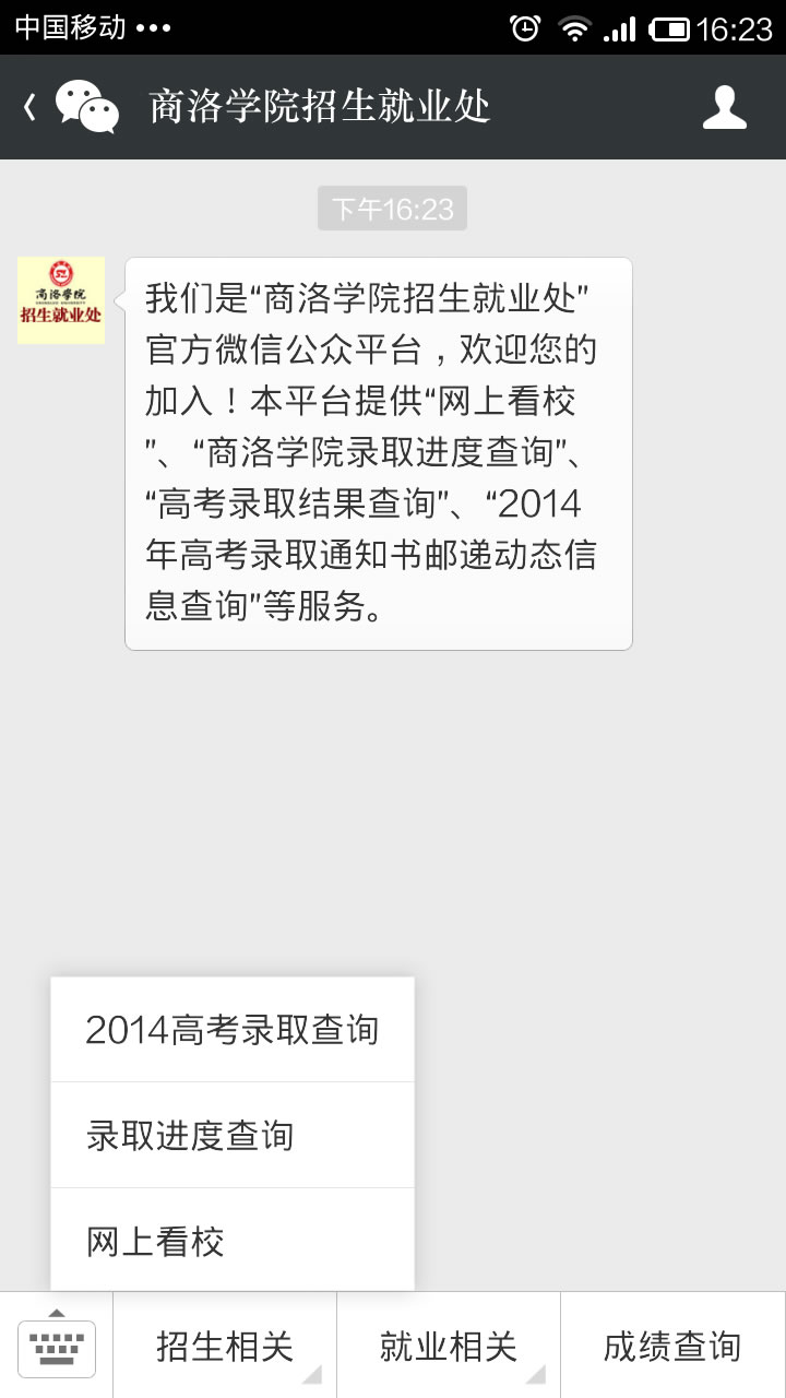 2014年4月,我校招生就業處開通微信公眾平臺和高考通知書郵遞查詢系統(http://www.sxsssy.com/cx/),考生及家長可在填報志愿期間直接通過微信公眾平臺實現網上看校直通車服務,高考錄取期間查詢“商洛學院錄取動態和結果”,錄取后可查詢“錄取通知書郵遞動態信息”。