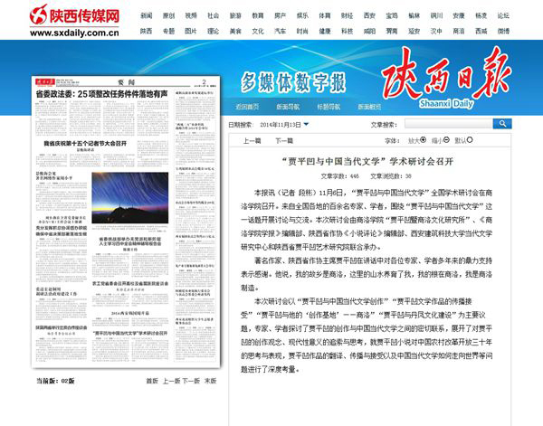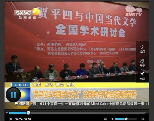 陜西廣播電視臺:11月8日陜西一套《第一新聞(午間播報)》欄目http://www.snrtv.com/content/2014-11/08/content_11808462.htm#(點擊該網(wǎng)絡鏈接,查找該頁面下方第13個新聞視頻《“賈平凹與中國當代文化”全國學術(shù)研討會在商洛召開》)