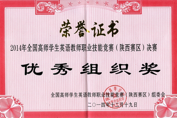 12月19日,2014年全國高師學生英語教師職業技能競賽(陜西賽區)決賽在西安文理學院舉辦。來自全省十余所師范類高校英語專業的80余名學生參加了此次競賽。經過激烈角逐,我校語言文化傳播學院英語系鄧林娟、鄭麗分別獲得二級、一級一等獎,張小琴、郭強強分別獲得二級、一級二等獎,我校被全國高師學生英語教師職業技能競賽(陜西賽區)組委會授予優秀組織獎。