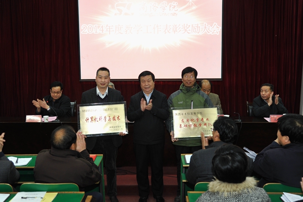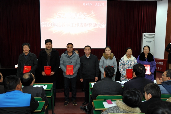 在熱烈的掌聲中,黨委書記張景書為省級本科教學工程項目授牌,校長劉建林、黨委副書記左曉民、紀委書記王思懷分別為2014年度教學技能競賽優勝者、校級本科教學工程精品課程、校級教學名師、校級雙語教學示范課程、優秀實習帶隊教師、優秀教案及優秀電子課件獲獎者頒發榮譽證書。左曉民宣讀了表彰決定。