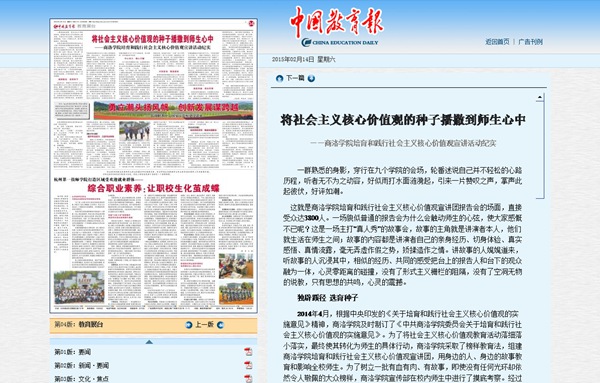 該文全文鏈接如下:《將社會主義核心價值觀的種子播撒到師生心中》http://paper.jyb.cn/zgjyb/html/2015-02/14/content_430782.htm?div=-1