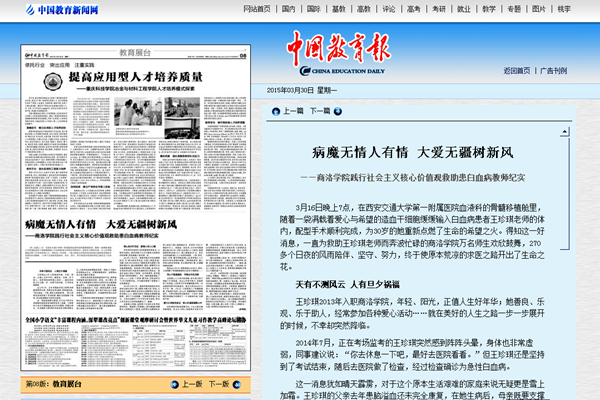 3月30日,《中國教育報》第8版以《病魔無情人有情 大愛無疆樹新風》為題,對我校踐行社會主義核心價值觀救助患白血病教師王珍琪系列活動進行了報道。該文一經刊發,新華網、中國網等全國各大媒體紛紛轉載,在社會上引起了強烈反響。