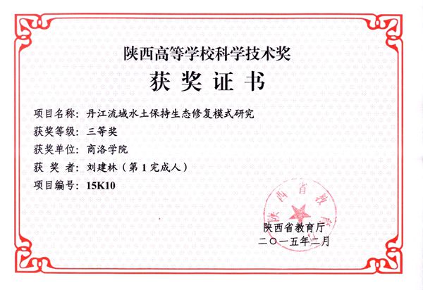 根據陜西省教育廳《關于公布2015年度陜西高等學校科學技術獎的通知》(陜教技〔2015〕3號),由我校劉建林教授主持申報的《丹江流域水土保持生態修復模式研究》,榮獲2015年度陜西高等學校科學技術獎三等獎。