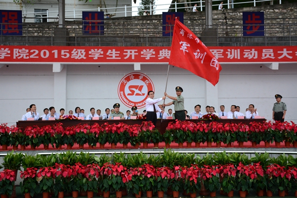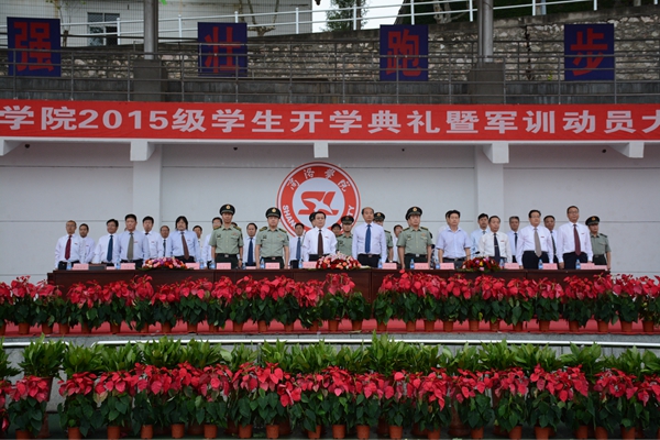 驕驕學子,今登堂明入室,星夜兼程圓好夢;巍巍黌門,才送往又迎來,躬耕不輟育國魂。9月8日,我校隆重舉行2015級學生開學典禮暨軍訓動員大會。校領導張景書、劉建林、王思懷、魏書堂、彭虎軍、范新會、劉寶盈,解放軍西安政治學院黨委常委、院務部部長邱仕偉大校,解放軍西安政治學院政治部副主任張新軍大校,解放軍西安政治學院軍事系教授、學生軍訓團團長劉京生大校,商洛市人民政府副秘書長宋奇志出席了大會。校黨委書記張景書向承訓教官授2015級學生軍訓團團旗,校黨委副書記、校長劉建林作了重要講話。大會由校黨委副書記彭虎軍主持。各院部黨政負責人、各職能部門負責人與2015級新生參加了大會。