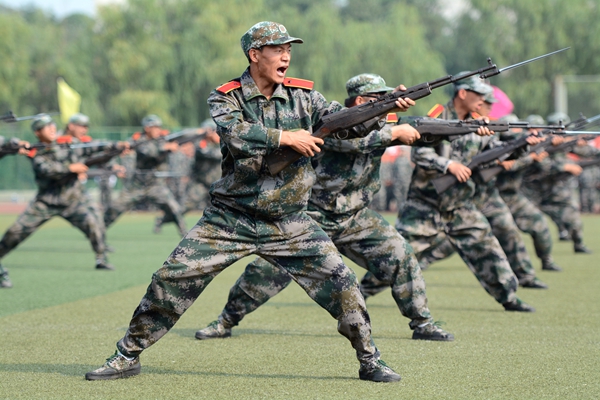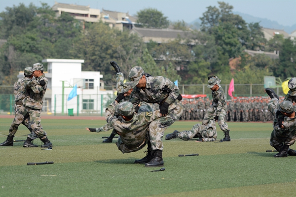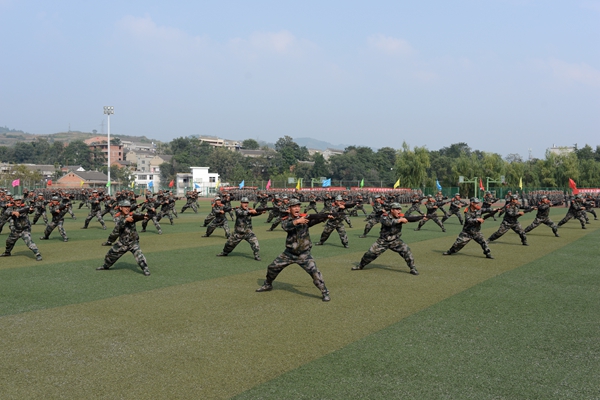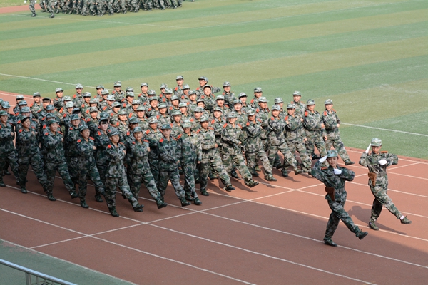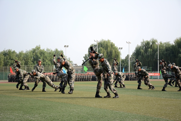 軍訓團各連組成持槍方陣、刺刀方陣、衛(wèi)生兵方陣等25個受閱方陣進行了分列式表演。同學們口號嘹亮、動作整齊、步伐穩(wěn)健、英姿颯爽,以嚴整的軍容軍姿依次通過主席臺,充分展現(xiàn)了我校學生的精神風貌。分列式結(jié)束后,我校學生進行了刺殺操、花樣隊列和軍體拳匯報表演。男子刺殺操動作整齊利落、殺氣騰騰,展示了壓倒一切敵人的英雄氣概。伴隨著《強軍戰(zhàn)歌》的激揚旋律,300名女兵進行了花式隊列表演,她們排出了巨大的“70”“1945 2015”字樣,紀念抗日戰(zhàn)爭暨世界反法西斯戰(zhàn)爭勝利70周年,表達我校學生“銘記歷史、緬懷先烈、珍愛和平、開創(chuàng)未來”的堅定信念;在校歌《正道直行做棟梁》的旋律中,同學們又擺出了我校校徽的立體造型,引來現(xiàn)場熱烈的掌聲。由720人表演的軍體拳動作精煉、節(jié)奏分明、套路連貫、氣勢磅礴、喊殺聲震天,贏得了現(xiàn)場陣陣熱烈的掌聲。軍訓教官也進行了捕俘拳表演,將現(xiàn)場氣氛推向了高潮。