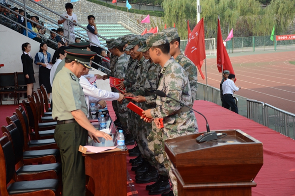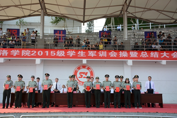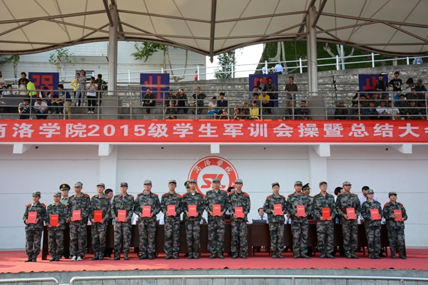 校武裝部部長、軍訓團政委石啟英宣讀了2015級軍訓工作先進集體及個人的表彰決定。主席臺上的領(lǐng)導和嘉賓為軍訓隊列先進集體、軍訓內(nèi)務先進集體、軍訓工作優(yōu)秀教官、軍訓工作先進個人及軍訓優(yōu)勝標兵代表頒發(fā)了獎牌和證書。
