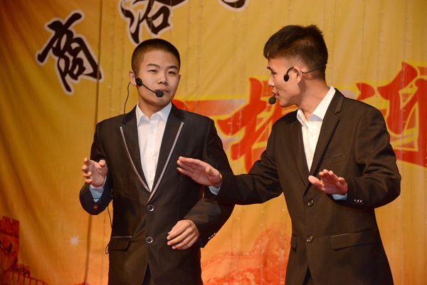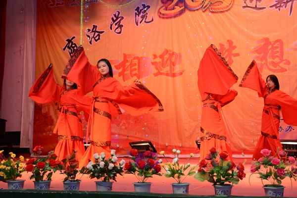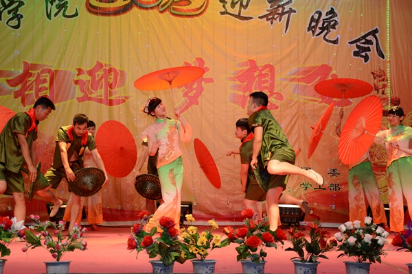 晚會以“心相迎 夢想飛”為主題。在大合唱《游擊隊隊歌》和校歌《正道直行做棟梁》的動人旋律唱中拉開帷幕。整場晚會形式多樣,現代與古典同臺,聲樂與器樂相和,浪漫與詼諧相伴。歌舞、相聲、朗誦、魔術、樂器聯奏等精彩的節目為觀眾呈現了豐盛的視聽盛宴。為紀念中國人民抗戰暨世界反法西斯戰爭勝利70周年,由藝術學院劉威老師帶來的《紅歌聯唱》將整場晚會渲染出了紅色的氣息,激昂的歌聲與清靈的鋼琴悠揚的笛聲相宜相合贏得了一陣陣贊美與掌聲。城鄉規劃與建筑工程學院學生帶來的相聲《地理圖》用毫不遜色于銀幕相聲的精彩表演給整個會場帶來了不息笑聲與不絕的掌聲。由商洛劇團的演員帶來的商洛花鼓戲《夫妻觀燈》表現了商洛本地戲曲的魅力,也預示了我校戲曲學院的蓬勃發展。最終,在一首《共筑中國夢》的師生歌伴舞中,整場晚會步入高潮,在陣陣掌聲中落下帷幕。