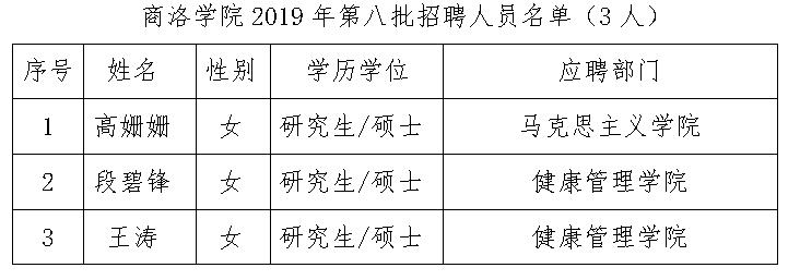 根據陜西省人社廳《關于陜西省事業單位公開招聘人員辦法》規定及《商洛學院2019年人才招聘計劃》,經過資格審查、試講、專家面試等環節考察,并經院長辦公會2019年6月13日研究,同意招聘高姍姍等3位同志來我校工作,現予以公示。如有異議,請于2019年6月25日前向人事處或監察室反映。