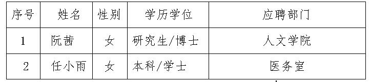 根據(jù)陜西省人社廳《關(guān)于陜西省事業(yè)單位公開招聘人員辦法》規(guī)定及《商洛學(xué)院2020年人才招聘計劃》,經(jīng)過資格審查、試講(筆試)、專家面試等環(huán)節(jié)考察,并經(jīng)院長辦公會2020年8月19日研究,同意招聘阮茜等2位同志來我校工作,現(xiàn)予以公示。如有異議,請于2020年8月27日前向人事處或紀(jì)委辦公室反映。