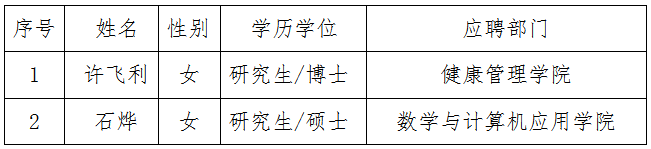 根據陜西省人社廳《關于陜西省事業單位公開招聘人員辦法》規定及《商洛學院2020年人才招聘計劃》,經過資格審查、試講、專家面試等環節考察,并經院長辦公會2020年9月17日研究,同意招聘許飛利等2位同志來我校工作,現予以公示。如有異議,請于2020年9月25日前向人事處或紀委辦公室反映。