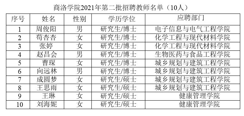 根據陜西省人事廳《關于陜西省事業單位公開招聘人員辦法》規定及《商洛學院2021年人才招聘公告》,經過資格審查、試講、專家面試等環節考察,并經院長辦公會2021年1月11日研究,同意招聘周俊陽等10位同志來我校工作,現予以公示。如有異議,請于2021年1月15日前紀委辦公室或人事處反映。