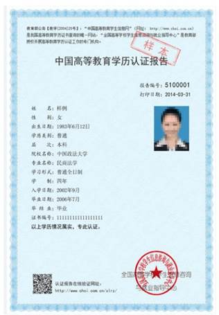 4.在境外獲得學歷證書的考生除上述對應類別應該提交的材料外還須上傳教育部留學服務中心出具的《國外學歷學位認證書》原件。示范照片如下: