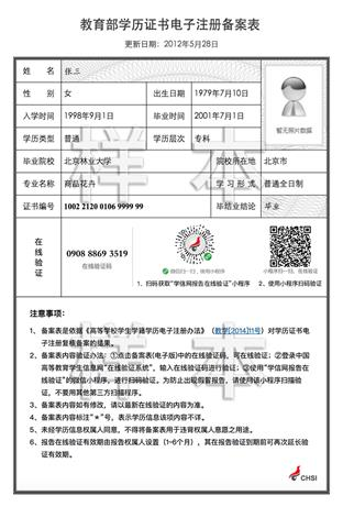 2.對于往屆考生,網報學歷校驗通過的,只提供畢業證書照片;網報學歷校驗未通過的還須提供“中國高等教育學生信息網”的《教育部學歷證書電子注冊備案表》或《中國高等教育學歷認證報告》。示范圖片如下: