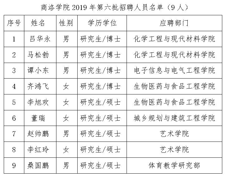 根據陜西省人社廳《關于陜西省事業單位公開招聘人員辦法》規定及《商洛學院2019年人才招聘計劃》,經過資格審查、試講、專家面試等環節考察,并經院長辦公會2019年4月19日研究,同意招聘呂華永等9位同志來我校工作,現予以公示。如有異議,請于2019年4月23日前向人事處或監察室反映。
