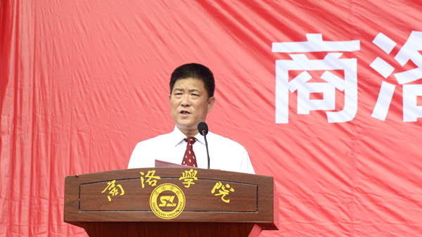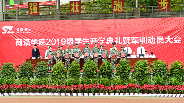 天朗氣清、秋風送爽,巍巍學府、德渥群芳。9月5日上午,我校2019級學生開學典禮暨軍訓動員大會在學校體育場隆重舉行。黨委書記龍治剛、校長范新會、紀委書記王思懷、黨委副書記彭虎軍,副校長劉寶盈、劉勇,商州區人民武裝部部長曹建明上校,武警商洛支隊副參謀長、軍訓團團長呂喆中校,2015屆校友、第44屆世界技能大賽銅獎獲得者、中航工業陜西飛機制造公司職工高雨楠出席大會。各二級學院(部)黨政主要負責人、有關職能部門負責人,2019級全體新生及家長代表參加大會。大會由彭虎軍主持。