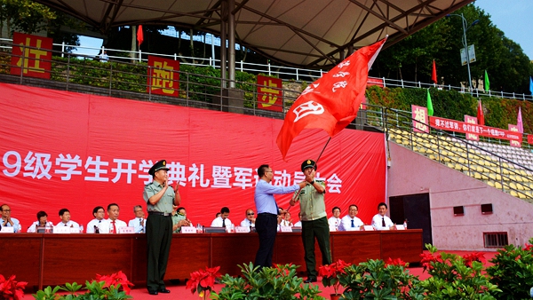 大會伊始,全體起立,奏唱國歌,升國旗。龍治剛為2019級學生軍訓團授團旗,范新會講話,劉勇宣讀了2019級新生獎學金表彰決定,出席大會的校領導與嘉賓為獲獎新生頒獎。