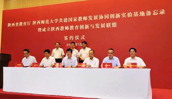 7月13日,陜西省教育廳與陜西師范大學共建國家教師發展協同創新實驗基地備忘錄暨成立陜西教師教育創新與發展聯盟簽約儀式在陜西師范大學舉行,副省長方光華出席簽約儀式并講話。省教育廳廳長王建利,陜西師范大學黨委書記程光旭、校長游旭群,我校黨委書記龍治剛以及延安大學、陜西理工大學等其他9所高校黨委書記或校長出席簽約儀式,簽約儀式由省教育廳副廳長劉建林主持。