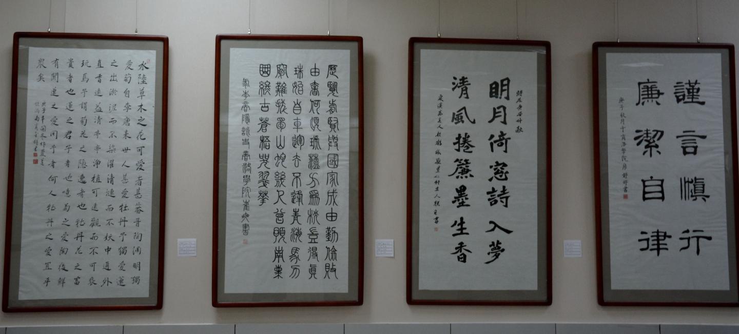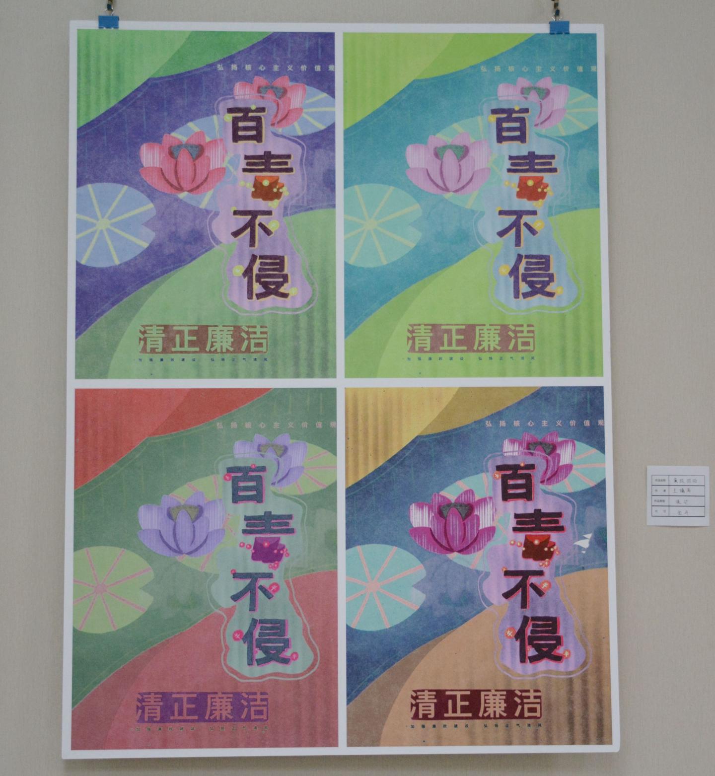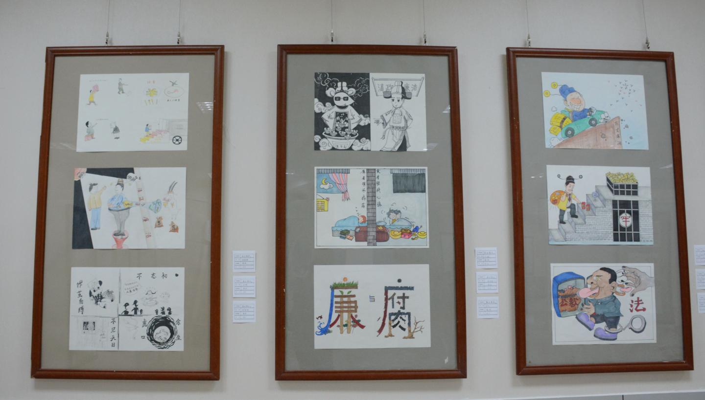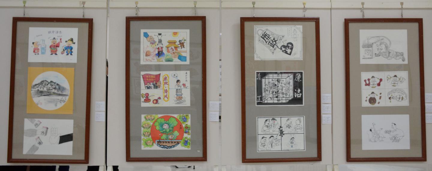 今年8月,校紀委組織開展了廉政文化建設創(chuàng)新工程項目活動,向全校師生征集廉政文化作品。活動啟動以來,各黨總支、直屬黨支部高度重視、積極參與,用多樣的形式詮釋“廉政”的內涵。活動共征集到廉政文化項目20個,經評審、整合、打磨,最終凝練為14個精品項目,包含原創(chuàng)書畫作品、歌曲、視頻、詩歌、理論研究文章等多種類別。其中,書畫作品展項目前期共征集書畫作品300余幅,經過多次甄選,最終優(yōu)選150余幅在本次作品展中進行了展出。此外,本次展出還播放了8部廉潔教育小視頻。