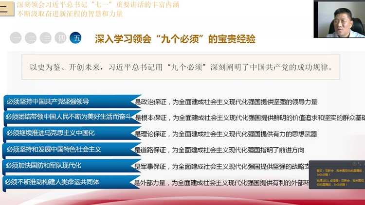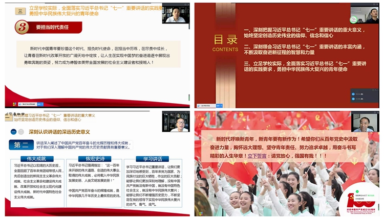 校領導的授課主題鮮明、內容豐富、深入淺出、各具特色,既有理論高度,又有思想深度,并靈活引用了《習近平講故事》和《習近平用典》中的鮮活事例,分析透徹、引人入勝,對廣大師生深入學習貫徹習近平總書記“七一”重要講話精神具有很強的指導性。授課期間,廣大學生紛紛通過在線平臺為校領導點贊,并在留言中踴躍抒發自己加強黨史學習、立志成才、勇擔民族復興大任的信心和決心。