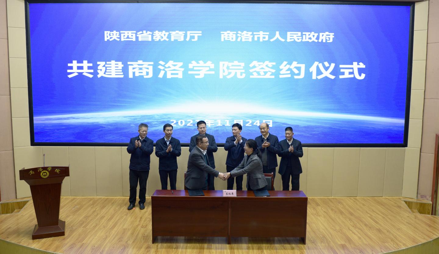 11月24日,陜西省教育廳與商洛市人民政府共建商洛學院第三期簽約儀式在我校隆重舉行。陜西省人民政府副省長方光華、中共商洛市委書記鄭光照出席簽約儀式。商洛市人民政府市長王青峰11月22日來校現場辦公,協調省市共建相關事宜。陜西省教育廳副廳長高嶺、商洛市人民政府副市長權雅寧分別代表陜西省教育廳和商洛市人民政府簽署省市共建商洛學院協議。未來5年,省教育廳和商洛市政府將共同支持我校進一步提升扎根商洛辦大學、服務商洛產業行業發展、改善辦學條件的能力,支持學校建成省級“一流應用型本科院校”。