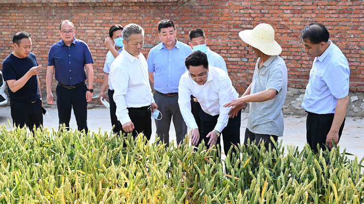 會后,張志昌與黃鵬一行實地察看了學校體溫檢測門使用情況、5G影院建設情況,前往小麥試驗田現場看望慰問了我校育種專家、高級實驗師于浩世,并進行了深入交流。