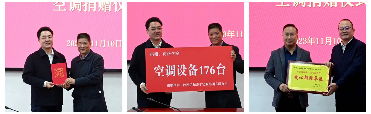 為進(jìn)一步改善學(xué)校辦學(xué)條件,經(jīng)友好協(xié)商,陜西億和盛豐實業(yè)集團(tuán)有限公司向我校丹江校區(qū)學(xué)生公寓樓C棟捐贈價值60余萬元的176臺空調(diào)設(shè)備。11月10日,我校舉辦空調(diào)設(shè)備捐贈儀式。陜西億和盛豐實業(yè)集團(tuán)有限公司董事局主席黃鵬、董事長黃濤出席捐贈儀式。校長范新會代表學(xué)校接受捐贈并向陜西億和盛豐實業(yè)集團(tuán)有限公司頒發(fā)捐贈證書。副校長郭瑾主持捐贈儀式并向企業(yè)頒發(fā)捐贈牌匾。
