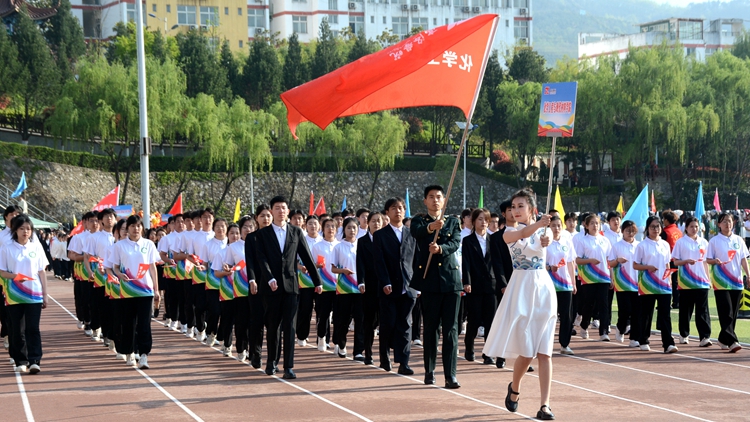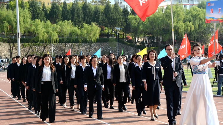 伴隨著激揚的《運動員進行曲》,國旗護衛隊、退役士兵方陣、彩旗方陣、花環方陣、裁判隊、各二級學院師生代表隊、附屬小學、附屬幼兒園和教職工代表組成的18個方陣邁著整齊穩重、鏗鏘有力的步伐依次走過主席臺,展現了我校師生昂揚向上的精神風貌。運動員代表楊振興、裁判員代表王蒙潔分別向大會宣誓。