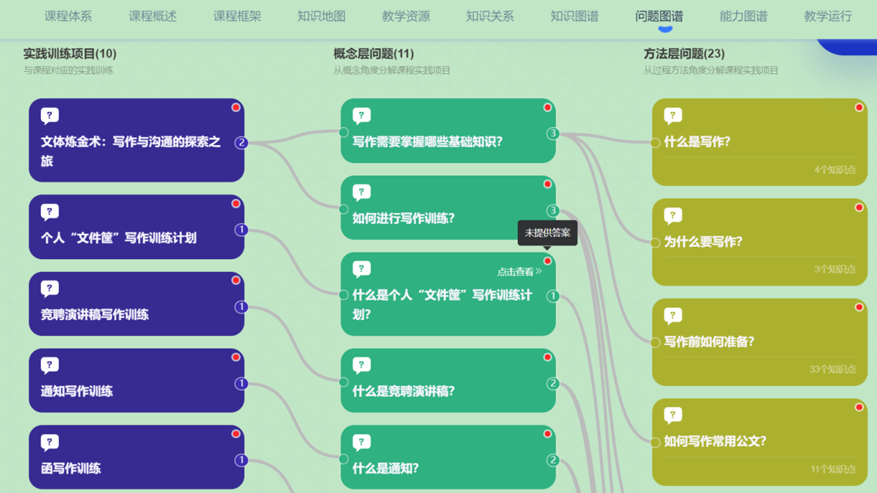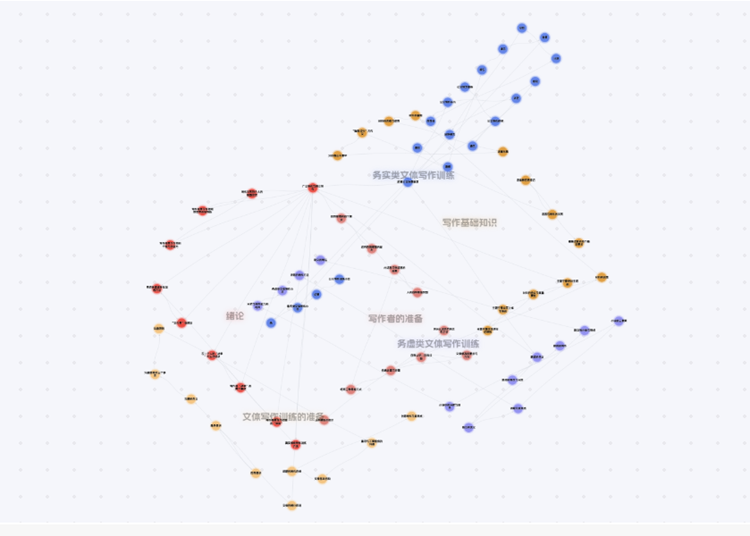 與傳統的視頻課程資源建設相比,知識圖譜課程更加智慧化、數智化,將可視化的課程體系呈現給師生,幫助教師在教學中更好地服務學生。課程采用工作情景模擬和角色意識提升的方法,將寫作理論置于實際情境中,以溝通為寫作核心,設計具有挑戰性的任務和項目,凸顯課程兩大特點:學法創新——寫作“文件筐”訓練法強化學生自我管理;成果導向——加深學生學習過程體驗,提升其寫作能力與溝通能力。同時,引入教育教學AI,將現有的課程資源進行碎片化再利用,給學生更多的學習資源選擇和路徑選擇。學生可基于知識點及關鍵詞,使用AI檢索教學資源;教師可利用AI技術,分析學生的學習行為和學習結果,綜合判斷學生對知識點的掌握度,更加精準地掌握學情,實現更好地“備學生”。
