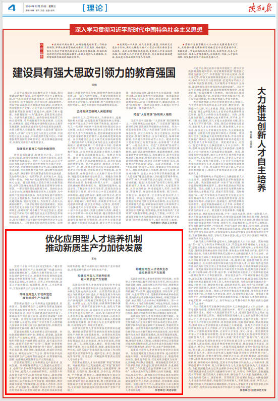 12月25日,《陜西日報》“理論”版面刊發了我校王怡教授以《優化應用型人才培養機制 推動新質生產力加快發展》為題的署名文章,文章結合我校辦學實際和校地協同發展經驗,深入剖析了高校在教育科技人才一體化發展背景下,如何培養高素質應用型人才,為新質生產力加快發展貢獻更多力量。