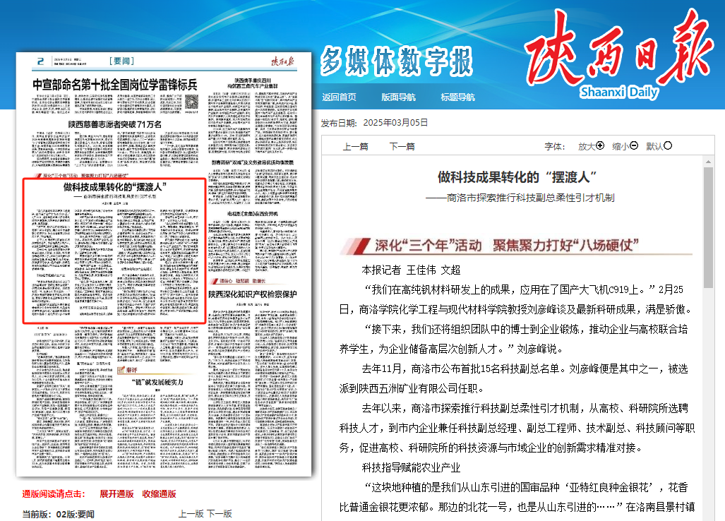 日前,《陜西日報》2版要聞欄目,以《做科技成果轉化的“擺渡人”》為題,專題報道介紹了商洛學院科研工作者把論文“寫”在商洛市“一都四區”建設產業鏈上的做法和經驗。