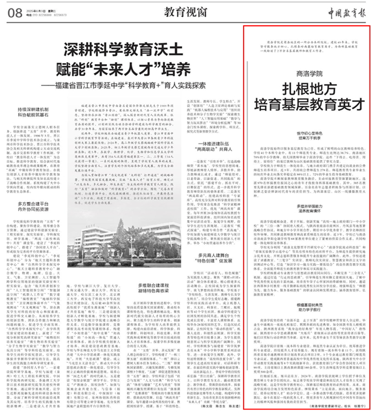 6月3日,《中國教育報》“教育視窗”欄目刊發了校長權雅寧署名文章《商洛學院扎根地方培育基層教育英才》,對我校扎根秦嶺培育教育人才的經驗成果進行了專題報道。