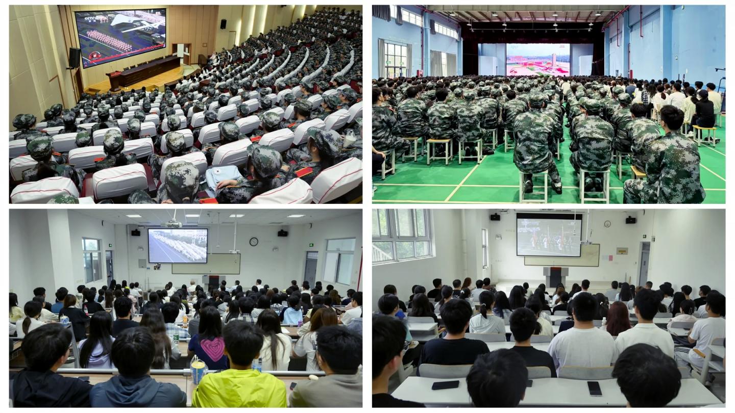 全體在校校領導,各職能部門、各二級學院黨政主要負責人以及全校科級以上干部在主會場共同觀看大會盛況。2025級新生、輔導員及其他無課師生在各分會場集中收看。大家精神振奮、熱情高漲,認真聆聽習近平總書記的重要講話,對閱兵式出場的各類方隊和新式武器裝備發出連連贊嘆,用熱烈的掌聲表達對祖國深深的祝福。