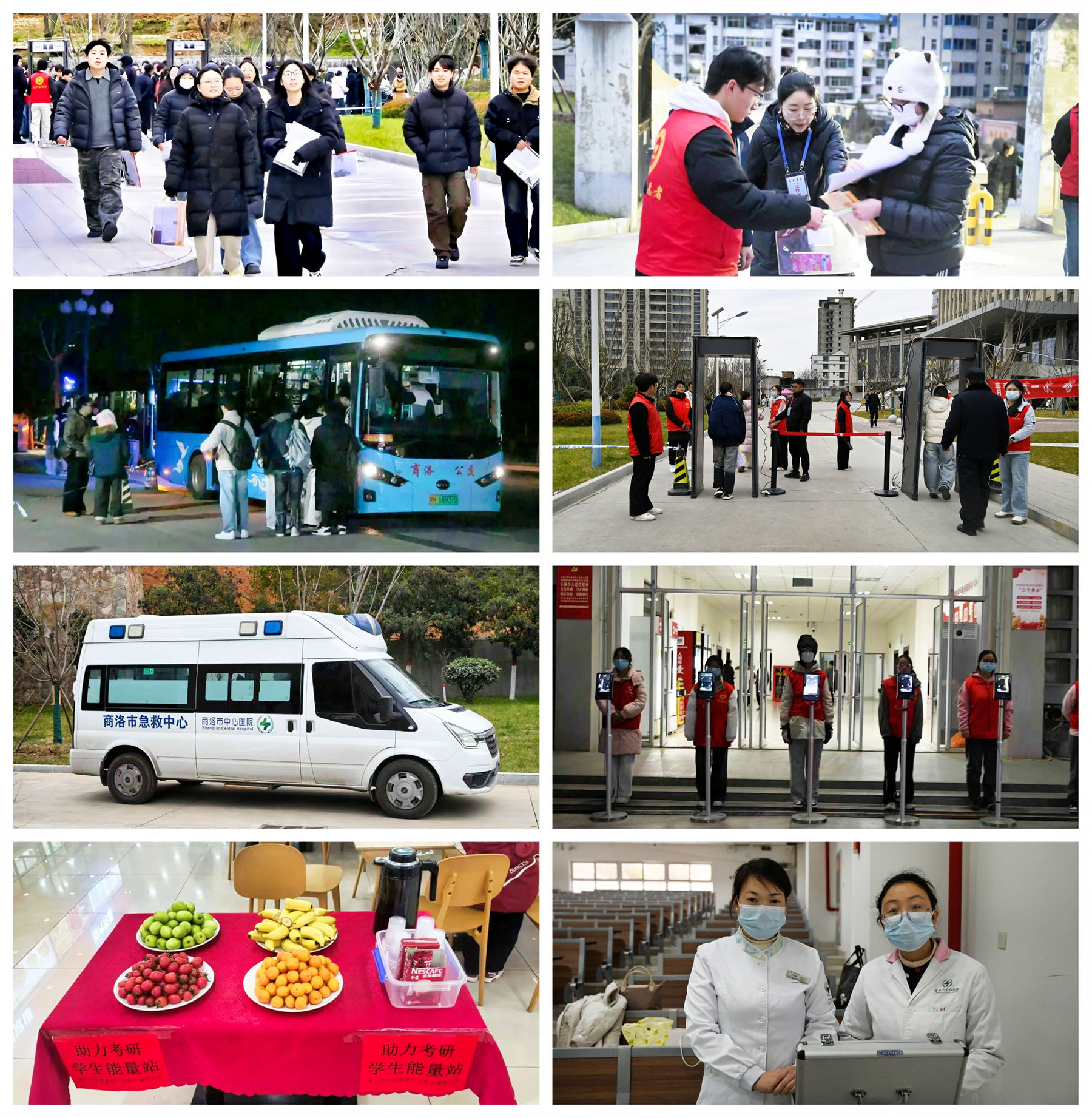 考試期間,各部門協(xié)同聯(lián)動,為考生營造安心、溫暖的考試環(huán)境。考點外設(shè)置物品存放處、醫(yī)療應(yīng)急點、熱水供應(yīng)站及考生休息區(qū),并提前通過學(xué)校官網(wǎng)發(fā)布考場指引、安檢須知、天氣交通等溫馨提示。電力、無線電、公安、衛(wèi)健等保障單位派駐人員全程值守,共同護航考試平穩(wěn)運行。