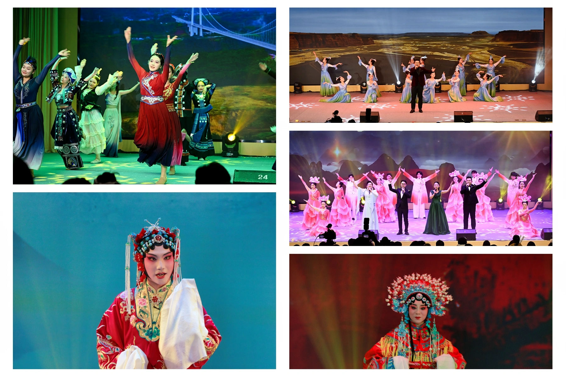 第三篇章“逐光而上·赴新程”激昂奏響奮進號角。歌伴舞《雪白的鴿子》寄托美好期盼;特邀專業演員與藝術學院合作的戲曲《盛世霓裳》華美亮相,國粹生香;大型民族舞蹈《民族歡歌》場面恢弘,舞出了團結奮進的磅礴氣勢;藝術學院傾力打造的歌伴舞《春風十萬里》,以壯麗的畫面與恢弘的歌聲,描繪出國家昌盛、萬象更新的動人畫卷。